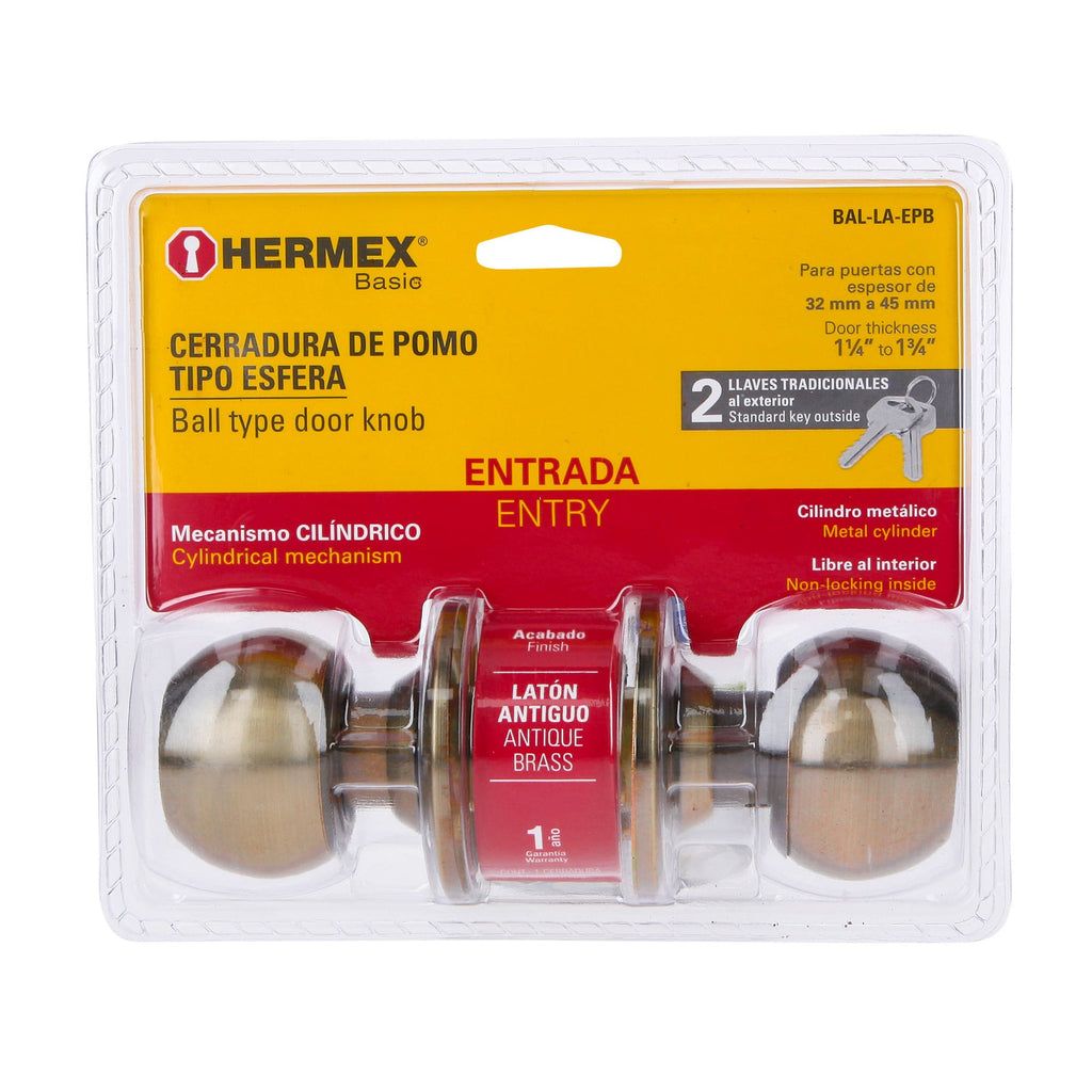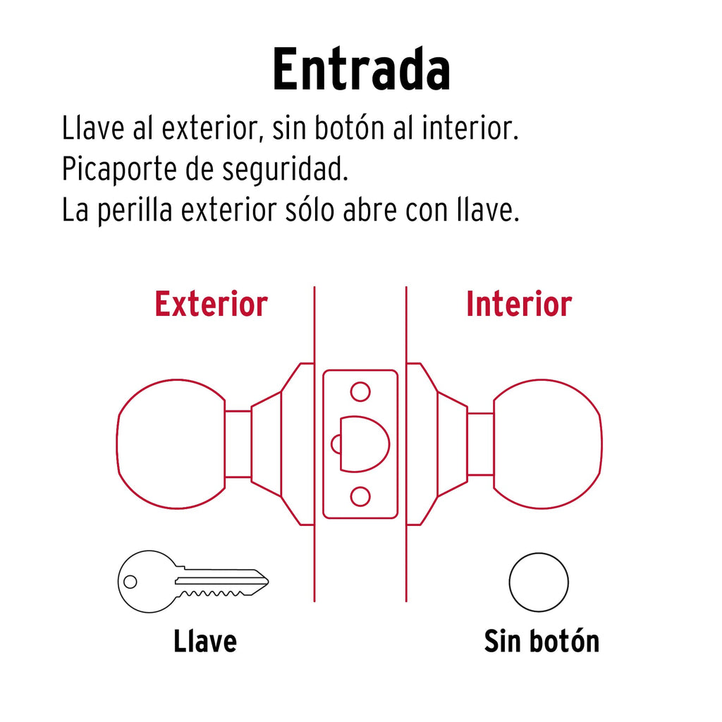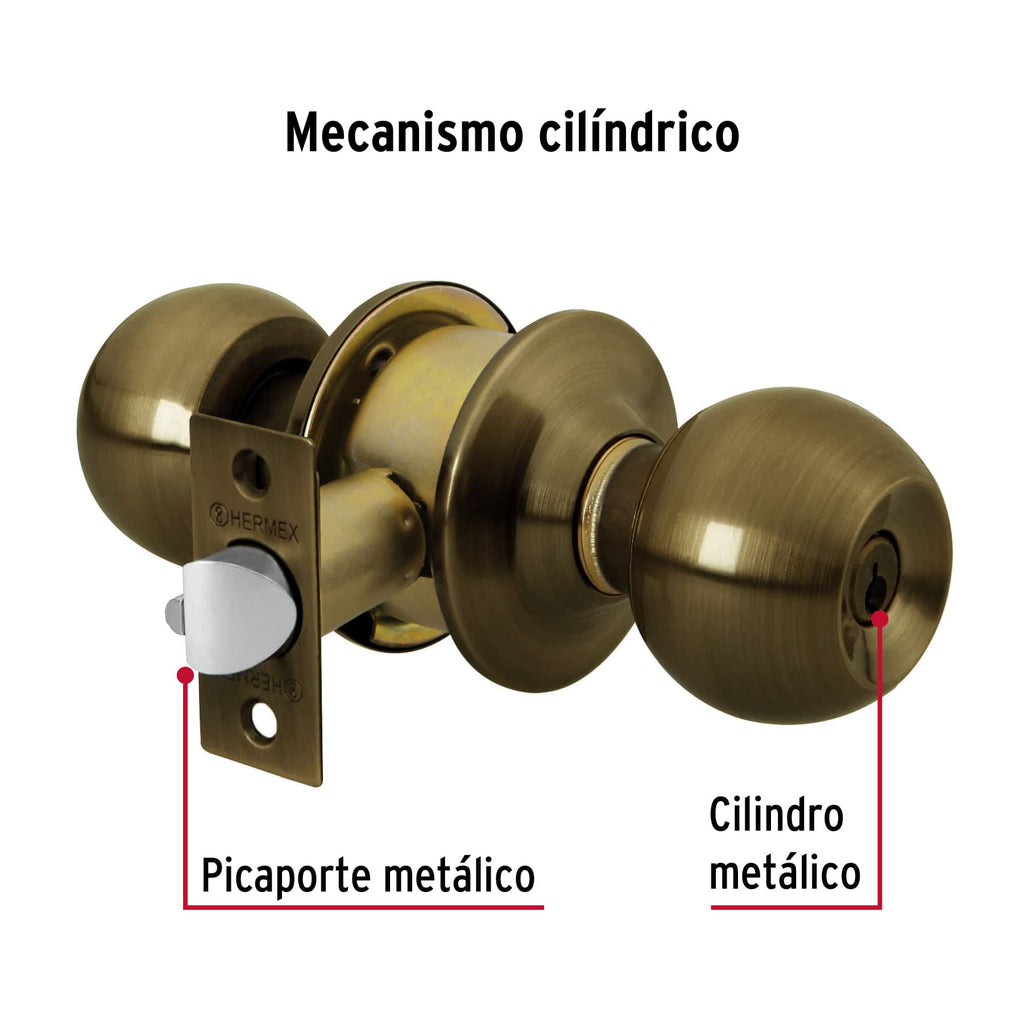 Cerrojo con llave al exterior sin botón de seguridad al interiorMecanismo cilíndrico con cilindro metálicoPerillas y escudo de acero, acabado latón antiguoPara colocación en puertas con espesor de 1-1/4" a 1-3/4" (32 a 45 mm)...