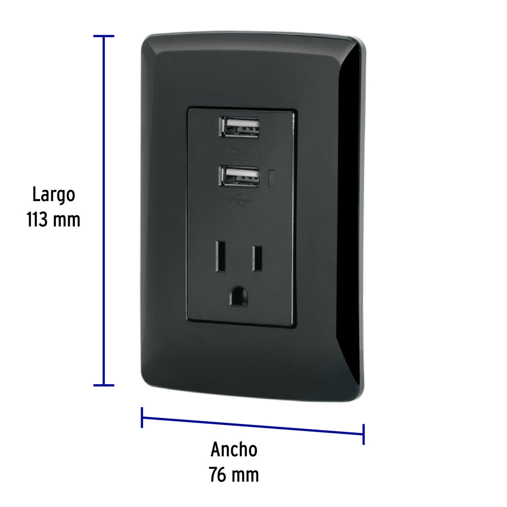 Placa de ABS, contacto de polipropileno y policarbonatoLED indicador de cargaPuertos USB tipo A, para cargar 2 celulares simultáneamente o 1 tabletaCon retardante a la flama para mayor seguridad