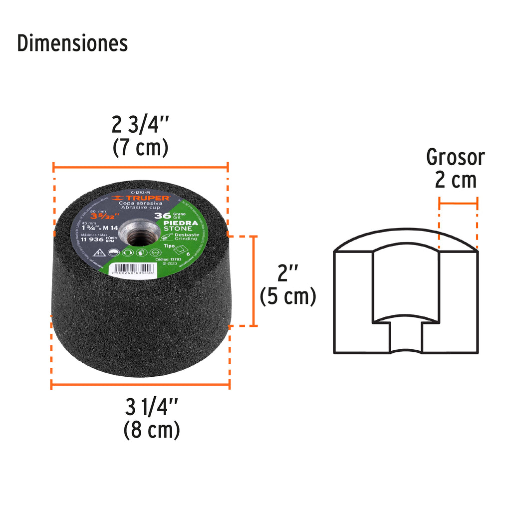 COPA DESBASTE DE PIEDRA 3-5/32' GRANO 36, EJE M14, TRUPER