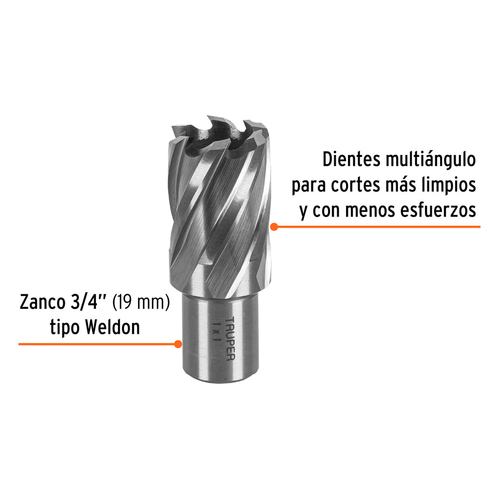 Fabricado en acero M2 de alta velocidad (HSS) para cortes más rápidosEntrada tipo Weldon 3/4" (19 mm)Compatible con taladros magnéticos de otras marcas del mercadoDientes multiángulo para cortes más limpios y con menos esfuerzo