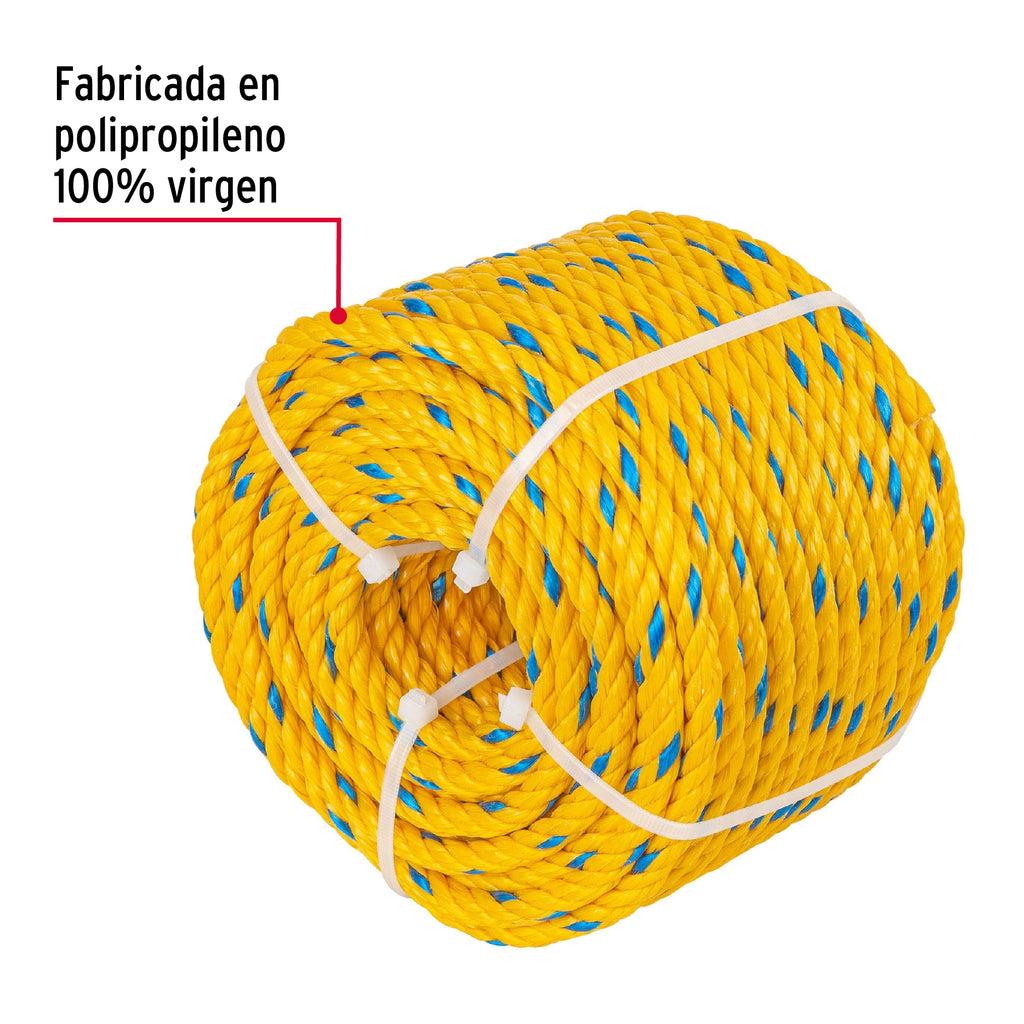 Fabricada en polipropileno 100% virgen, alta resistencia a la tensión, agentes químicos y no contaminaTrenzado de 4 cabos y filástica azulUso industrial, agrícola y en el hogar, ideal para el aseguramiento y/o amarre de cargaNo...