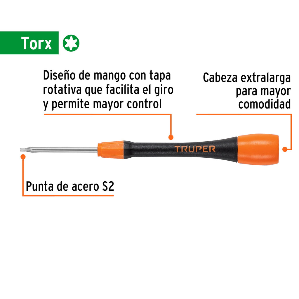 Mango ergonómico con tapa rotativa, que facilita el giro y permite mayor control en trabajos de electrónica y de precisión