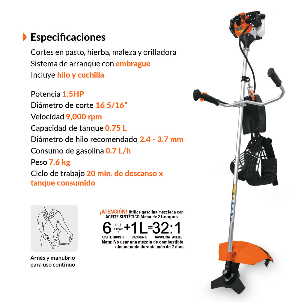 CARACTERÍSTICASDiseño de manubrio tipo "BICI" y arnés de carga, ideal para largas jornadas de trabajoAlimentación automática de hilo por sistema de golpeteoSistema de clutch que facilita el arranqueSistema de fácil cambio de equipos de corte...