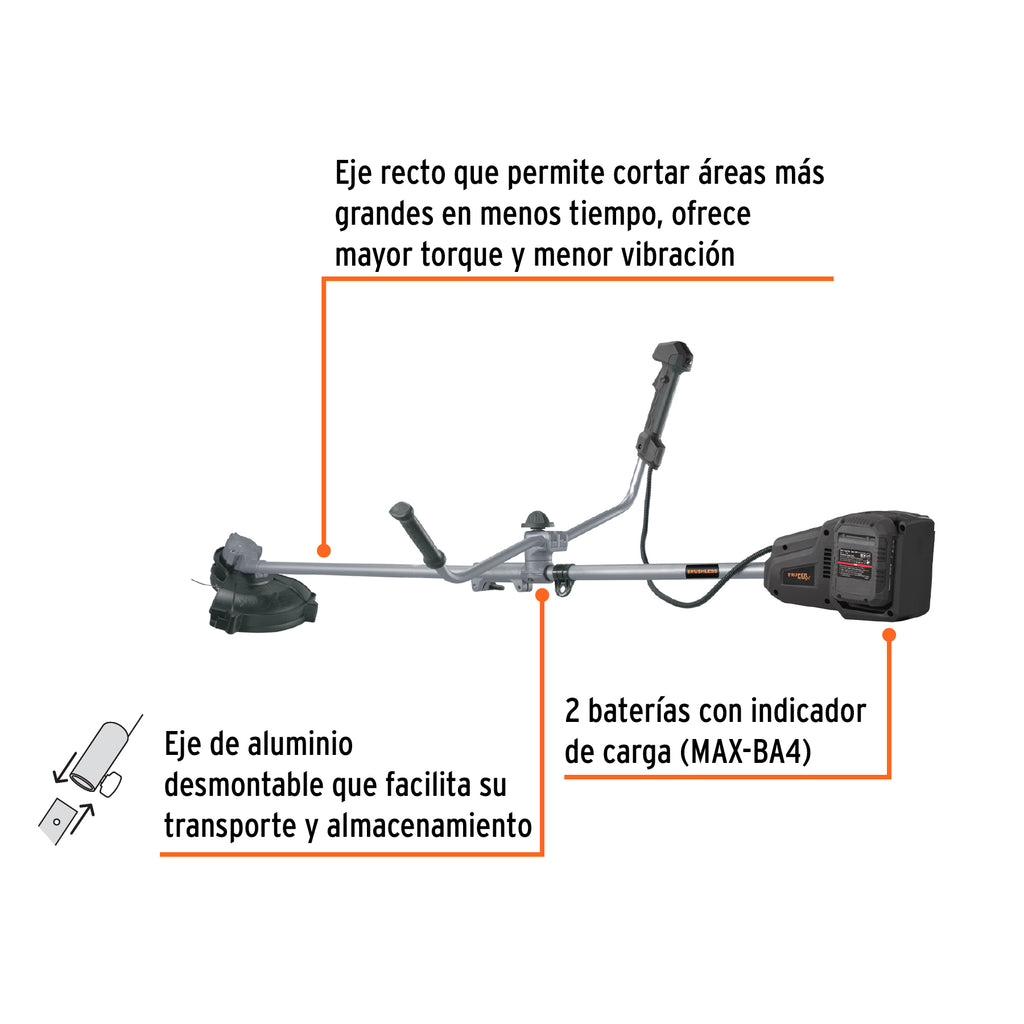Motor brushless, libre de mantenimiento Eje recto que permite cortar áreas más grandes en menos tiempo, ofrece mayor toque y menor vibración Función de desbrozadora y orilladora Eje de aluminio desmontable que facilita su transporte y almacenamiento Utiliza 2 baterías ion litio 4 Ah incluidas