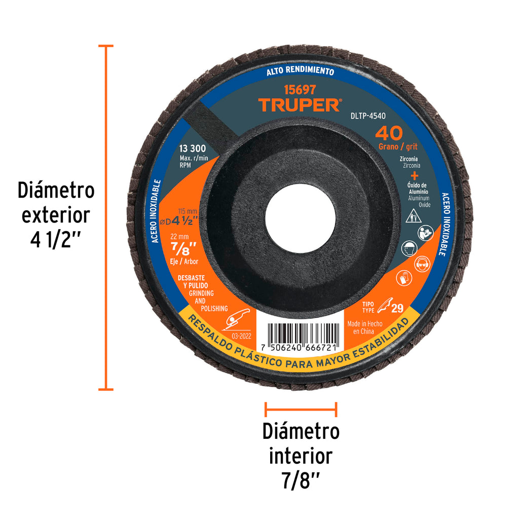 DISCO 4-1/2' LAMINADO RESPALDO PLASTICO GRANO 40 CENTRO 7/8'