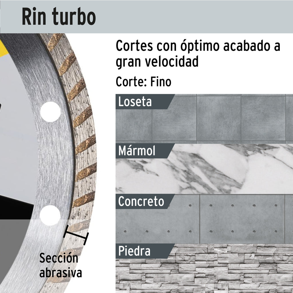 Rin turbo, balance entre rapidez y acabado finoSistema de enfriamiento y reducción de ruidoCorte en seco o húmedoPara corte rápido y fino en loseta, piedra, mármol y concretoCortes con óptimo acabado a gran velocidad