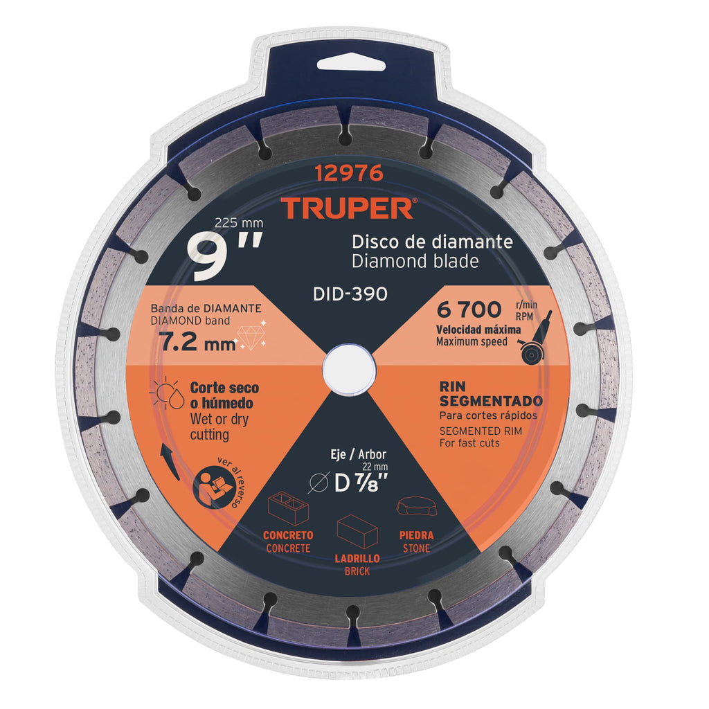 Rin segmentado, máxima velocidad de corte y alto rendimientoCorte en seco y húmedoPara corte rápido en concreto, block, ladrillo y piedraNo se recomienda para loseta o mármol
