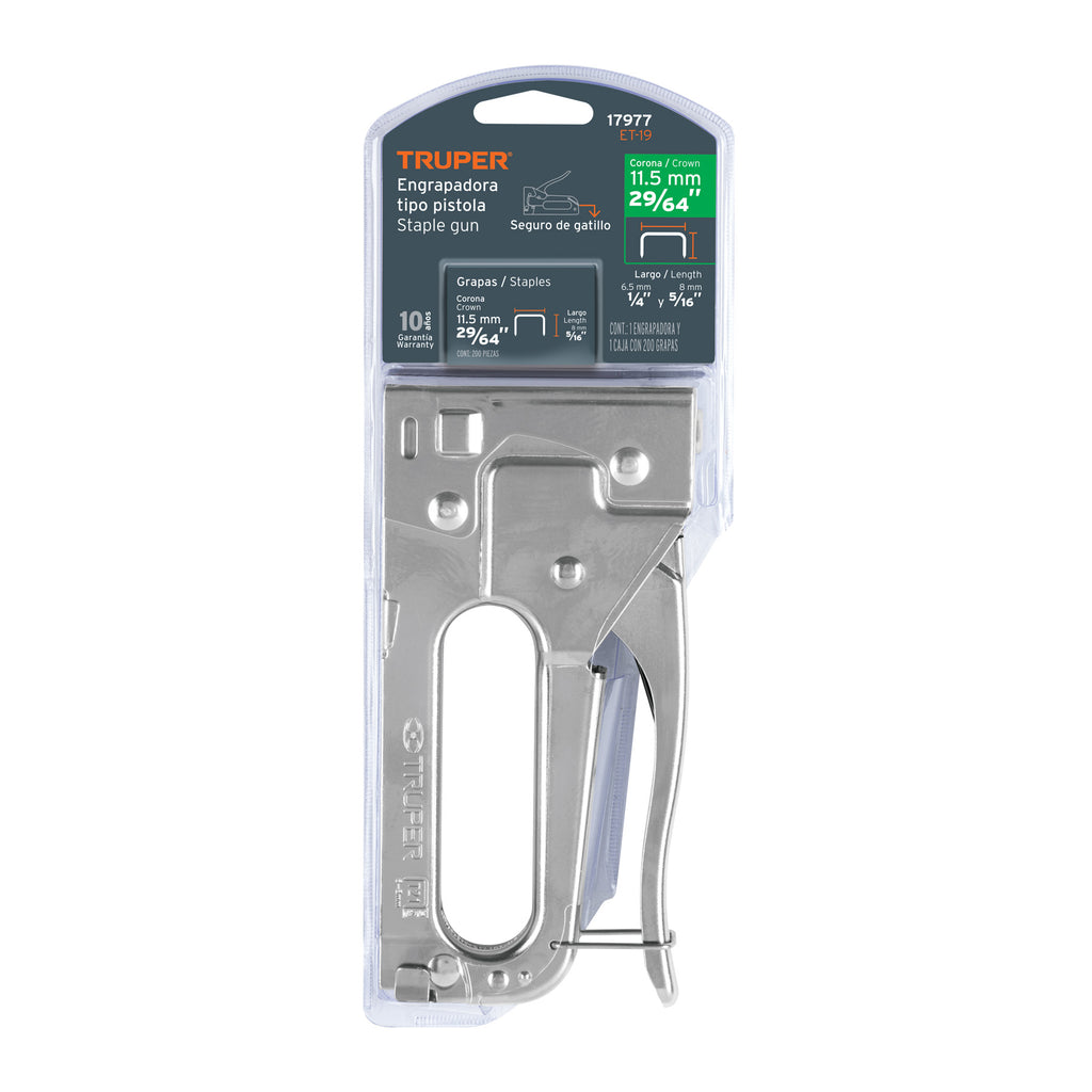 Cuerpo de acero con acabado cromado que evita la corrosiónFácil recarga de grapasSeguro de gatilloPara trabajo ligero, uso en revestimiento, alfombra y tapicería