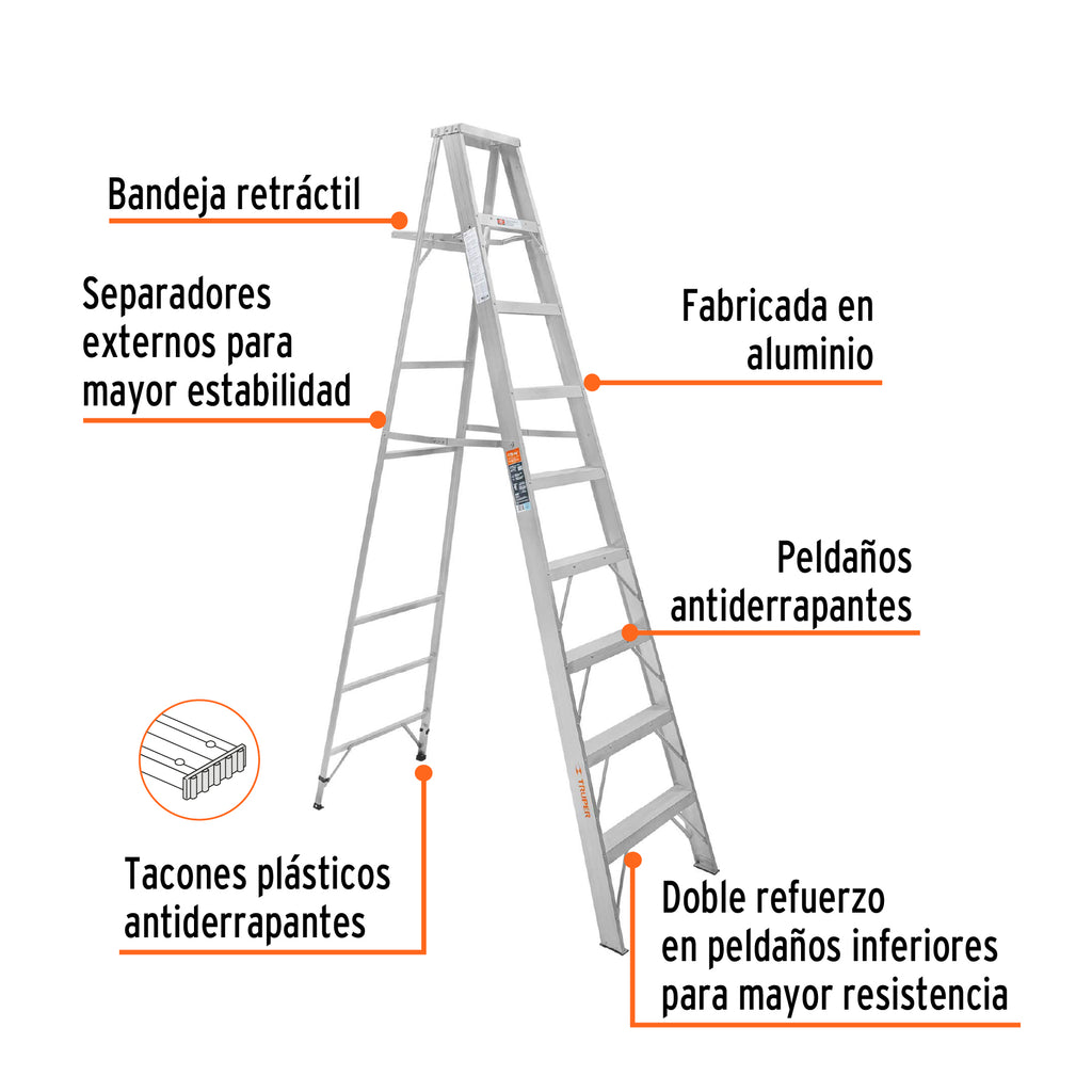 Fabricada en aluminioPeldaños antiderrapantes 3" (8 cm)Separadores externos para mayor estabilidadBandeja retráctilDoble refuerzo en peldaños inferiores para mayor resistencia