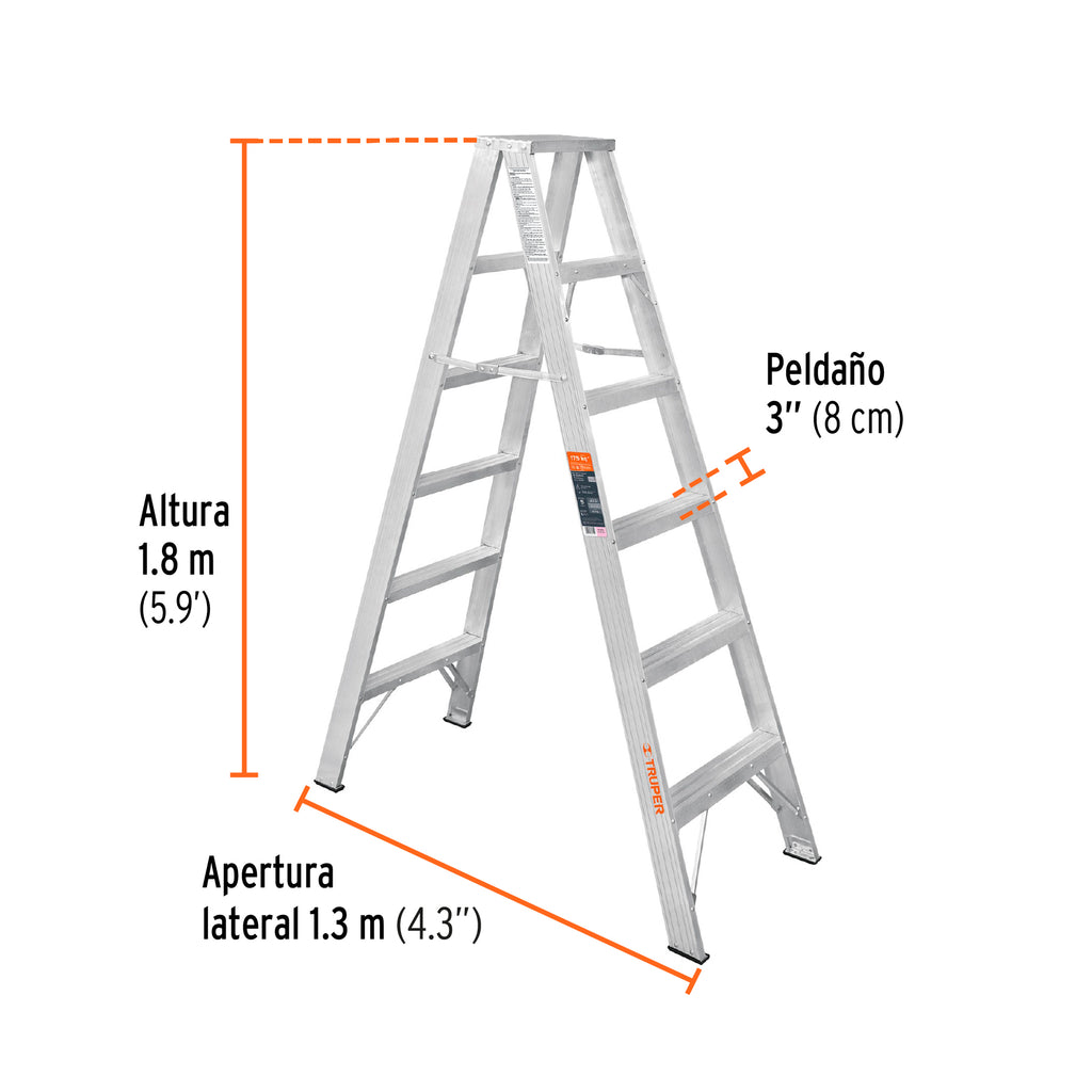 Fabricada en aluminioPeldaños antiderrapantes 3" (7.5 cm)Separadores externos para mayor estabilidadDoble refuerzo en peldaños inferiores para mayor resistencia*Alcance máximo para una persona de 1.68 m de estatura