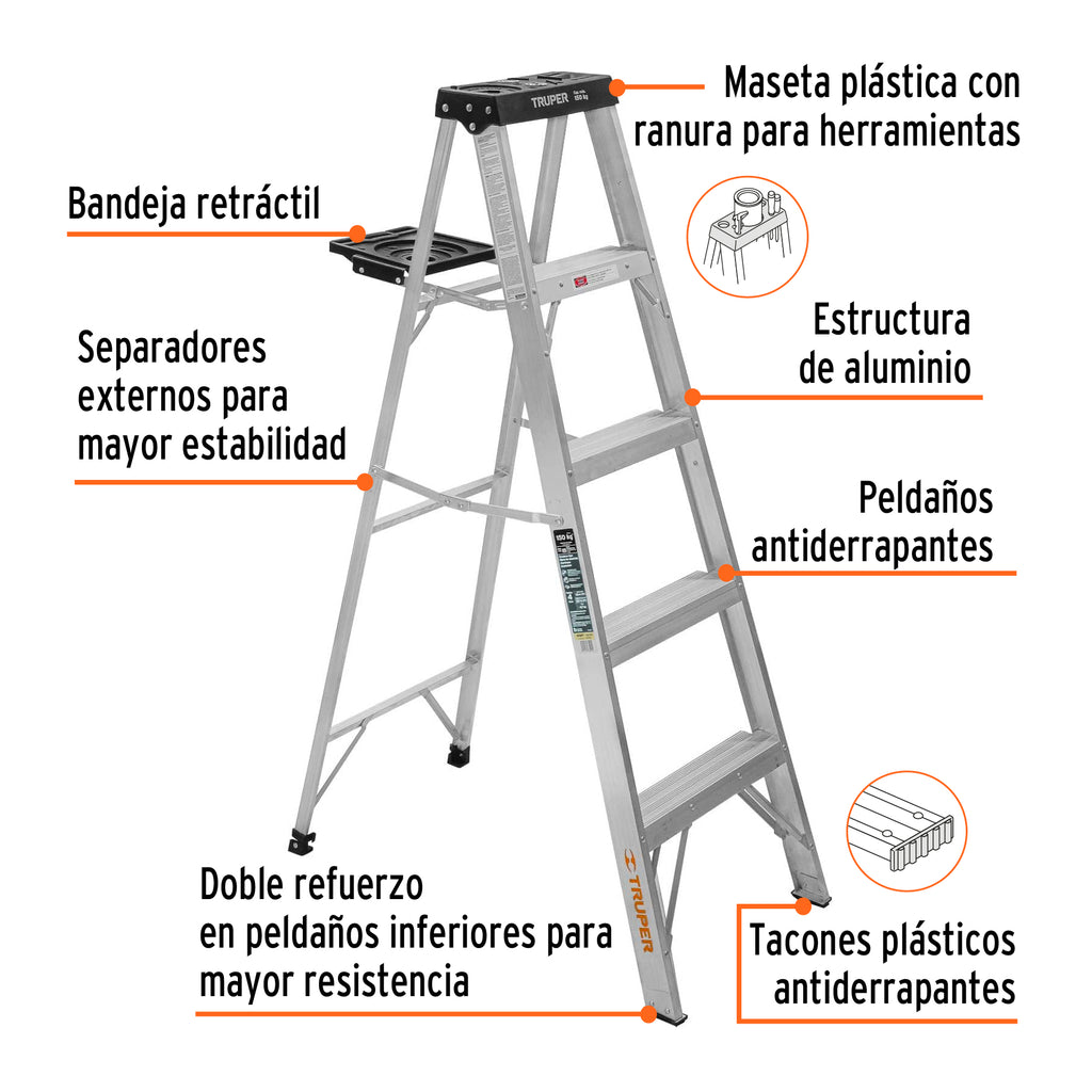 Estructura de aluminioPeldaños antiderrapantes 2 3/4" (7 cm)Separadores externos para mayor estabilidadBandeja retráctilDoble refuerzo en peldaños inferiores para mayor resistencia