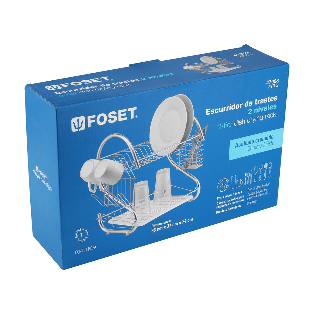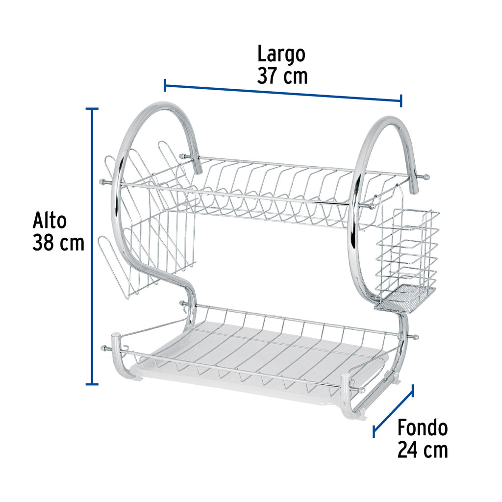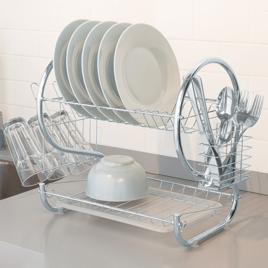 Fabricado en acero cromadoNivel inferior para vasos, tazones y otros utensiliosSegundo nivel para platosCanastilla doble desmontable para cubiertos y utensiliosPortavasos desmontableCROMO-1