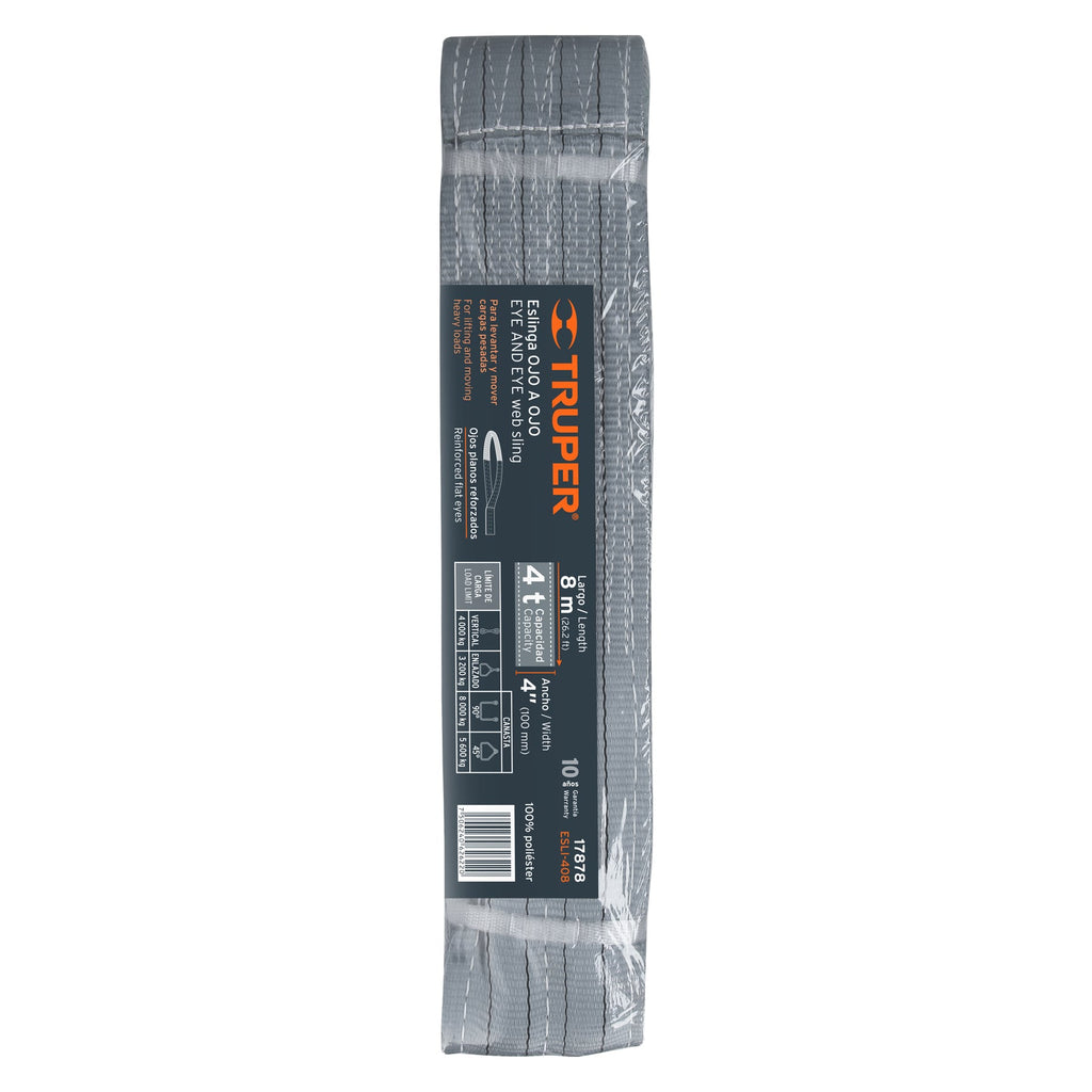 Banda plana 100% poliésterCapacidad de carga 4,000 kgOjos planos reforzadosNo daña la superficie de objetosPara levantar y mover cargas pesadas