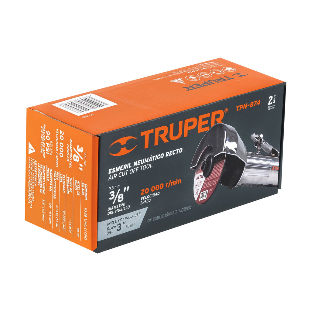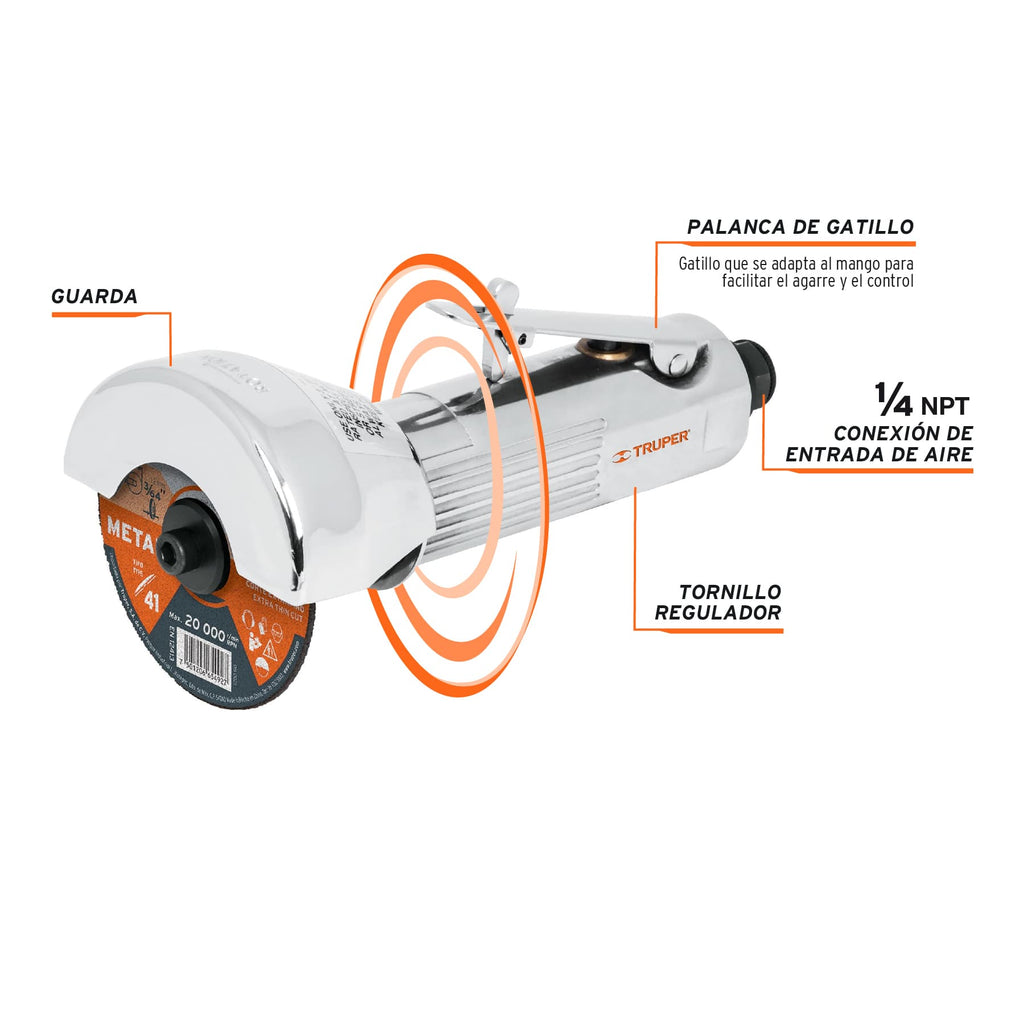 Carcasa de aluminio pulidoPalanca de gatillo que se adapta al mango para mejor agarre y mayor controlConexión de entrada de aire 1/4" NPTEje y diámetro interno de disco 3/8"