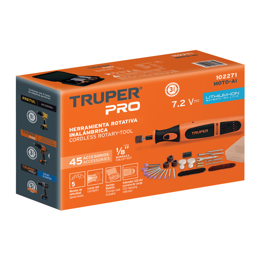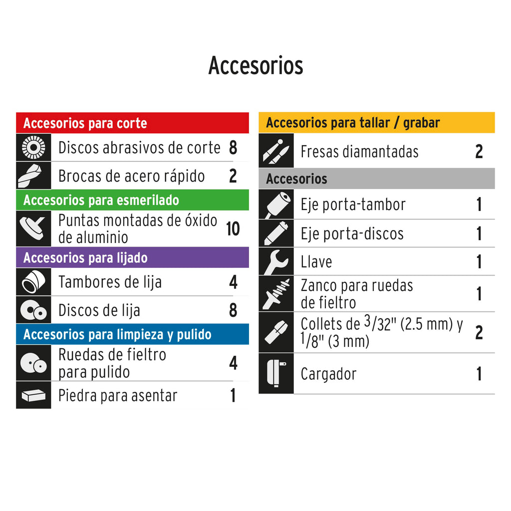Batería Ion litio, 2X más tiempo de vida y mayor velocidad de cargaCollet con boquilla de 1/8" (3 mm)Luz LED para iluminar el área de trabajoBotón de bloqueoIndicador de velocidades