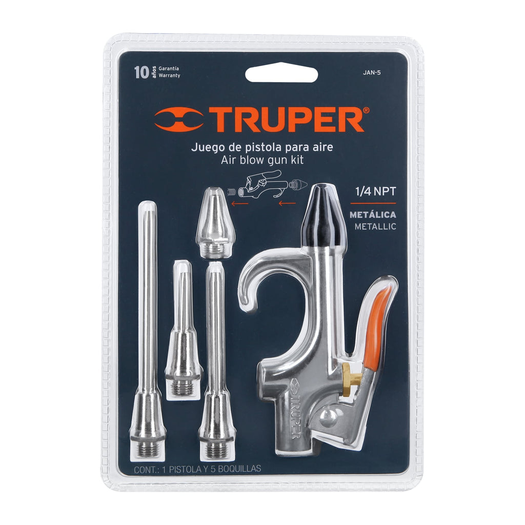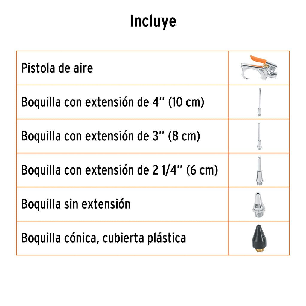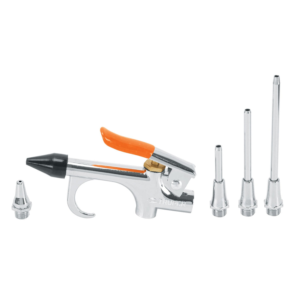 Pistola metálica de aire para sopletear, gancho para colgarseBoquilla cónica, cubierta plásticaBoquilla sin extensión y con extensiónPara herramientas neumáticasIdeal para limpiar e inflar