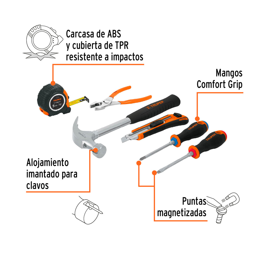 Flexómetro con carcasa de ABS y cubierta de TPR resistente a impactosMartillo con alojamiento imantado para clavosDesarmadores con puntas magnetizadas y mangos Comfort Grip