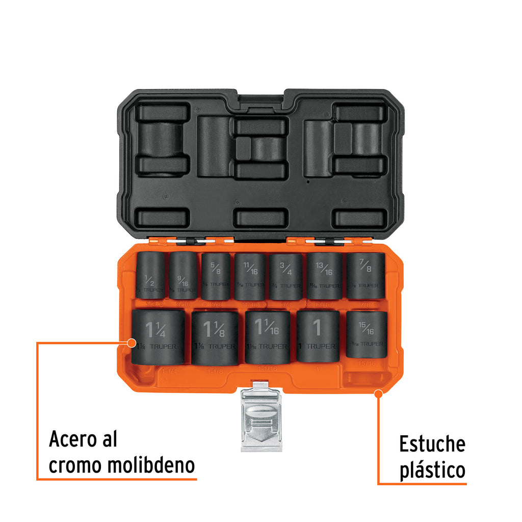 Fabricados en acero al cromo molibdeno con acabado fosfatado resistente a la corrosiónSistema de sujeción Truper-Drive con puntas convexas que aseguran y aumentan el torque sin dañar tuercas ni cabezas de tornillosMedida marcada para fácil...