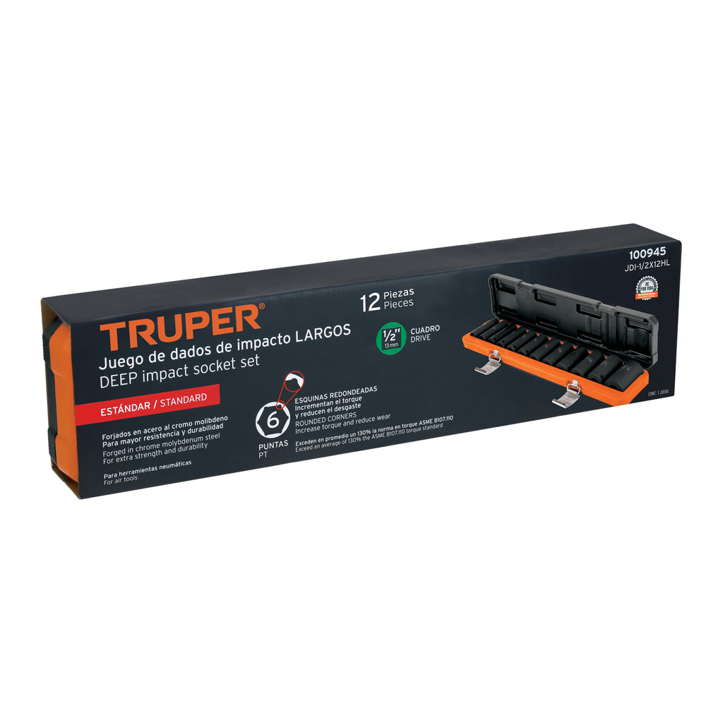 JUEGO DE 12 DADOS LARGOS CUADRO 1/2' DE IMPACTO 6 PUNTAS STD