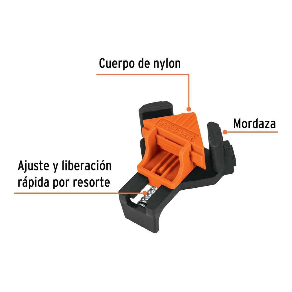Cuerpo de nylon y mordazas cubiertas de TPR que evitan el maltrato de superficiesOperación a una manoAjuste y liberación rápida por resorteApertura máxima 1"Para uniones de 90°