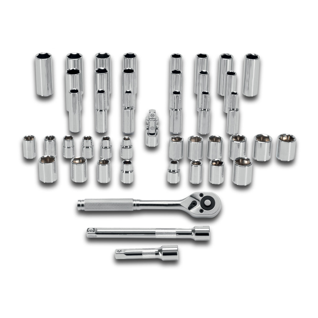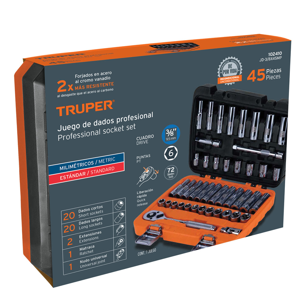 JUEGO DE 45 HERRAMIENTAS CUADRO 3/8' STD Y MM PARA MECANICO