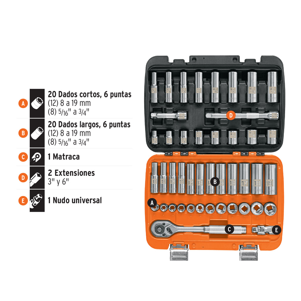 Dados en acero al cromo vanadioEstuche resistente de plástico inyectado que mantiene las piezas organizadasBroche metálico para mayor seguridadHerramienta marcada para fácil identificación