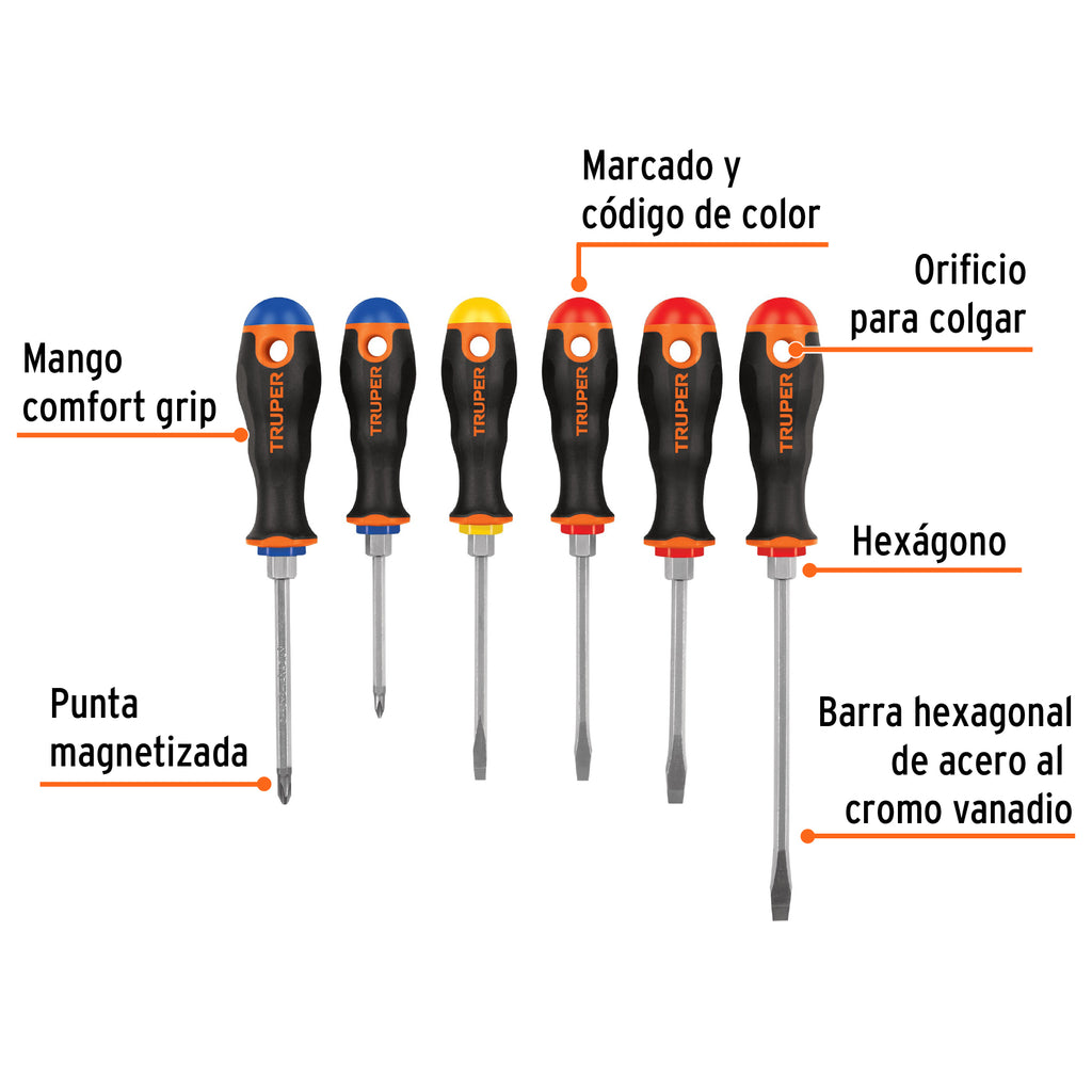 Barra hexagonal de acero al cromo vanadio 2X más resistente al desgaste que las de acero al carbono Mango comfort grip con orificio para colgar Marcado y código de color para fácil identificación de medida y punta Hexágono en la barra que maximiza el torque con llave