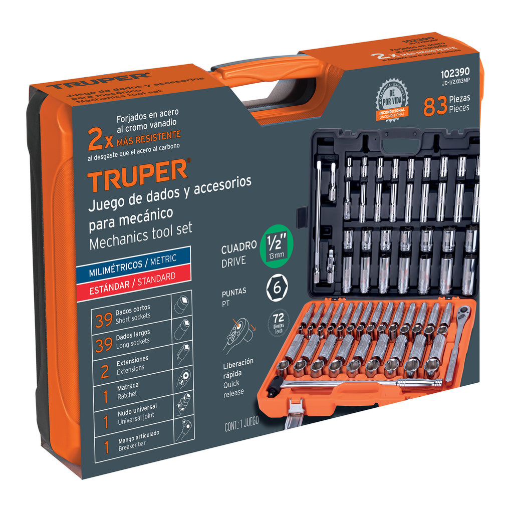 JUEGO DE 83 HERRAMIENTAS CUADRO 1/2' STD Y MM PARA MECANICO
