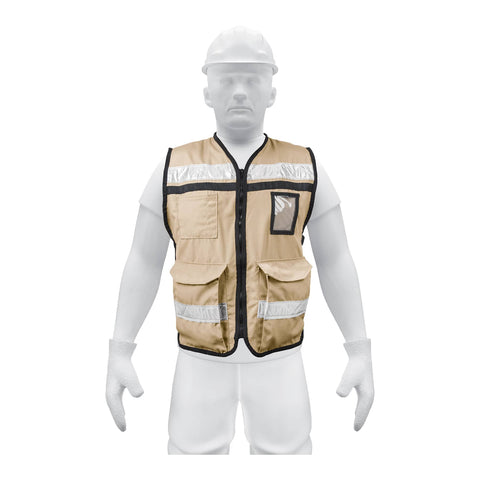 CHALECO BRIGADISTA CON CINTAS REFLEJANTES, COLOR BEIGE